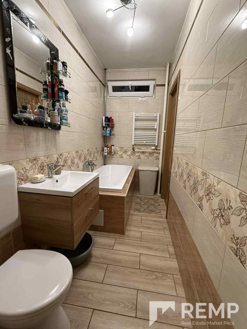 A fürdőszoba modern kialakítású, minőségi burkolatokkal és kádas megoldással.